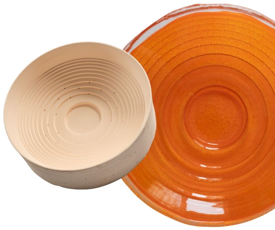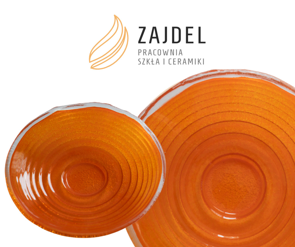 Drugie zdjęcie prezentuje finał tej drogi. Intensywnie pomarańczowy talerz to idealne odzwierciedlenie tego, co działo się w piecu. Zauważcie, jak precyzyjnie szkło oddało fakturę formy ceramicznej. Dzięki temu, że kontrolujemy cały proces – od lepienia formy po ostatni stopień temperatury w piecu – każdy produkt opuszczający Pracownię Zajdel jest unikatowy.